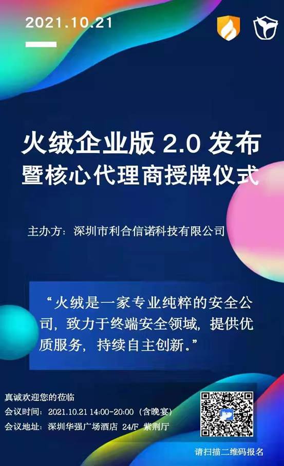 首發(fā)深圳站!首發(fā)深圳站! 火絨企業(yè)版2.0發(fā)布暨核心代理商授牌儀式,于2021.10.21即下周四下午舉行,誠邀各位朋友一起見證,共同成長!請掃描二維碼報名! “從前,某某大企業(yè)被看不見摸不著的”病毒“勒索“ 耳濡目染下,我們對數(shù)據(jù)傳輸已不在信任 火絨終端安全為殺毒而生 預(yù)見,終端威脅;遇見,專業(yè)防護(hù) 距離深圳首站火絨企業(yè)版2.0發(fā)布暨核心代理商授牌儀式還有7天! 請速速掃描下方二維碼報名!