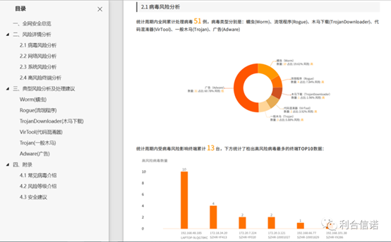 支持一鍵對當前中心進行安全狀況分析并導出報告。提供了全網(wǎng)概況一覽圖、風險詳情分析等。并且針對當前中心提供安全建議和常見風險等級、病毒介紹等。