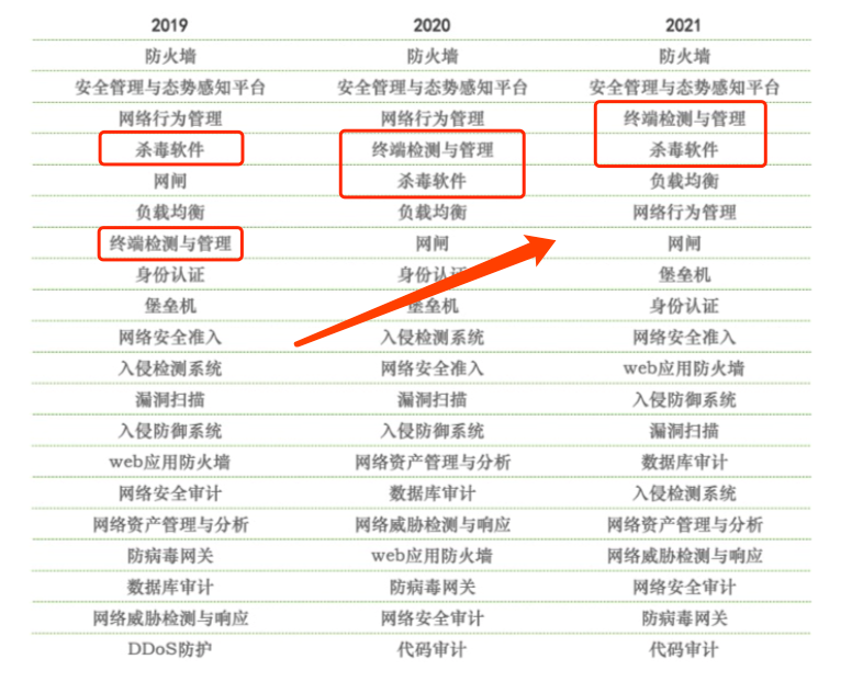 大的品類。其中,終端檢測與管理產(chǎn)品以及殺毒軟件采購量逐年遞增,企業(yè)越來越重視終端